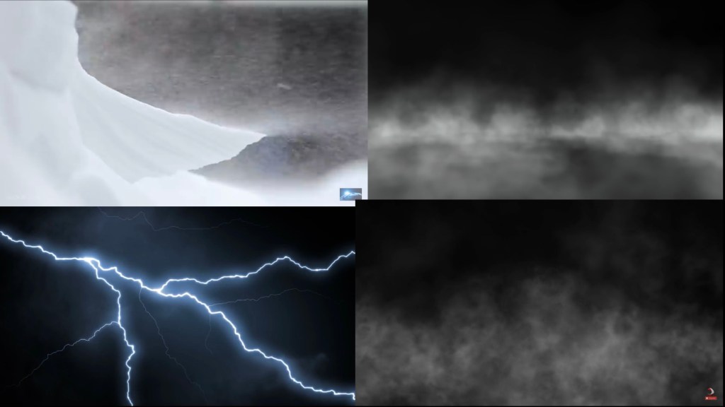 Here are screenshots of the videos found on Youtube to complete the cold antarctic feel of the shot. Show blasting, fog rolling, lightning, and additional smoke to convey a chaotic snow storm.