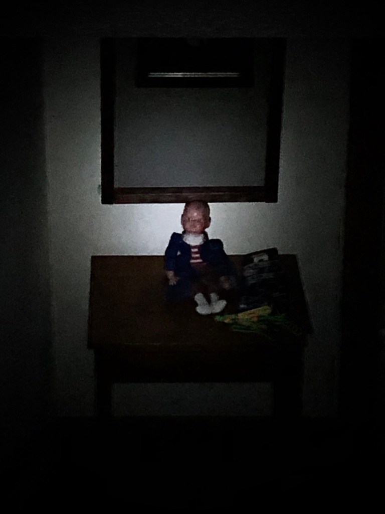 The above photo represents fear. I believe this photo (to me personally) represents fear. It is a dark setting with minimal light. The area that is visible contains a creepy baby doll. To many dolls are uncanny and have an unnatural vibe around them. So having a nearly dark photo with the uncanny doll as its centerpiece gives an uneasy feeling. As if something does not belong.