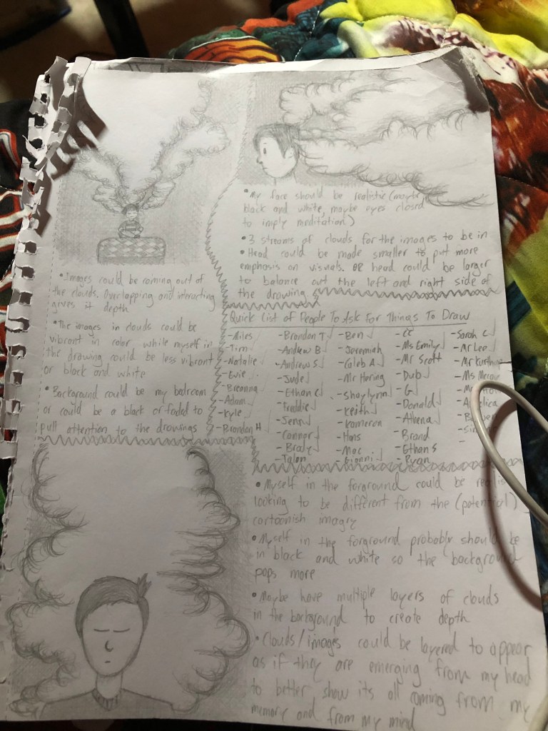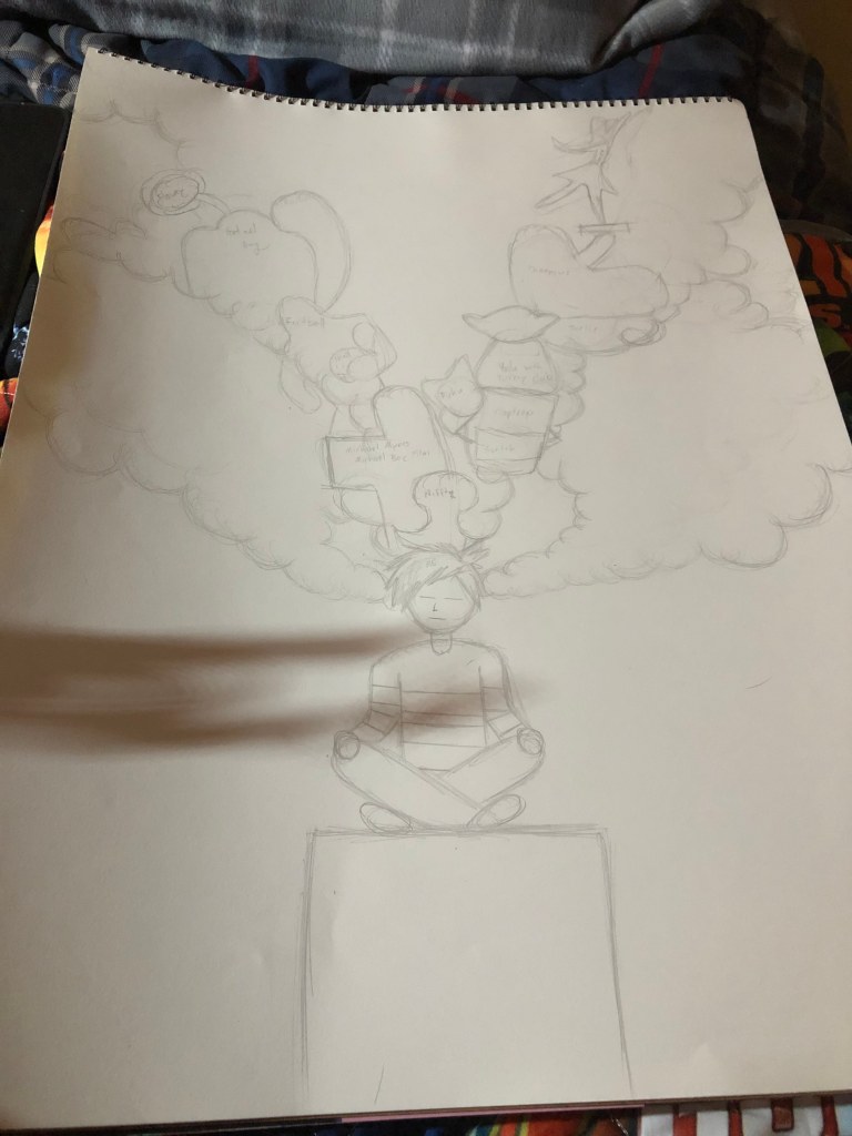 Today in terms of progress for my Junior year drawing I got a decent amount done. In terms of concepting for the final product. I am currently drawing a rough draft of the drawing, placing basic outlines and shapes of specific things where they could be at. I believe I currently have 11-13 of the listed characters/ things put in their respective places. Hopefully tomorrow or at the least Thursday I will have everything placed in their proper spaces and will be ready to draw the final thing sooner rather than later.
